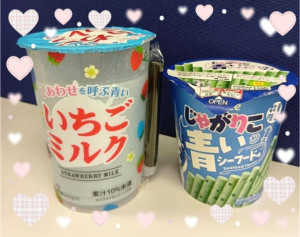 青いイチゴミルクと青いじゃがりこが今日のオヤツ〜ヾ(*’O’*)/